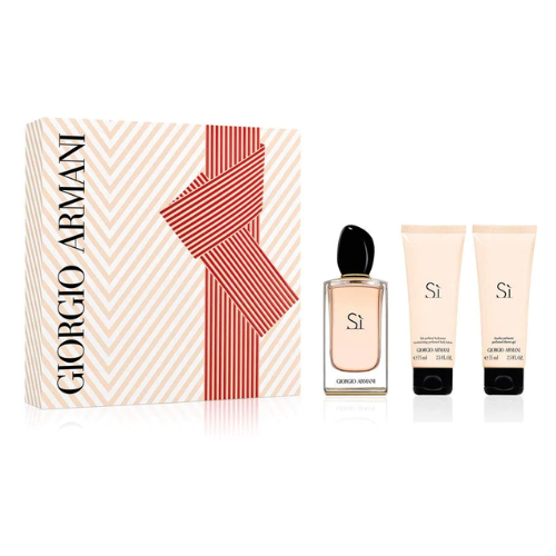Si by Giorgio Armani is a Chypre Fruity fragrance for women. Top note is Cassis; middle notes are May Rose and Freesia; base notes are Vanilla, Patchouli, Woody Notes and Ambroxan. Gift set includes Eau De Perfume 100 ml , Shower Gel 75 ml and Body Lotion 75 ml