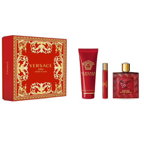 Eros Flame?by?Versace is a Woody Spicy fragrance for men.?Top notes are Mandarin Orange, Black Pepper, Lemon, Chinotto and Rosemary; middle notes are Pepper, Geranium and Rose; base notes are Vanilla, Tonka Bean, Texas Cedar, Sandalwood, Patchouli and Oakmoss. Set includes EDP 100 ml +Shower Gel 150 ml +Miniature 10 ml